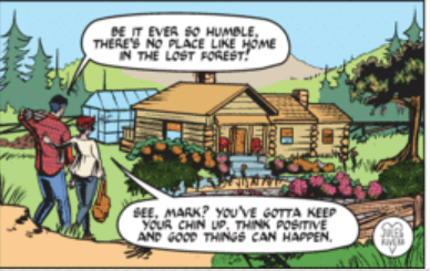 In fact, here is what the cabin looked like when Rivera started, back in October 2020. The resolution here is a bit poor, due to this being a copy of a copy of a digital copy. If you look through the strips since Rivera started, you will see that the Trail home changed several times to handle whatever the visual need was at that time.