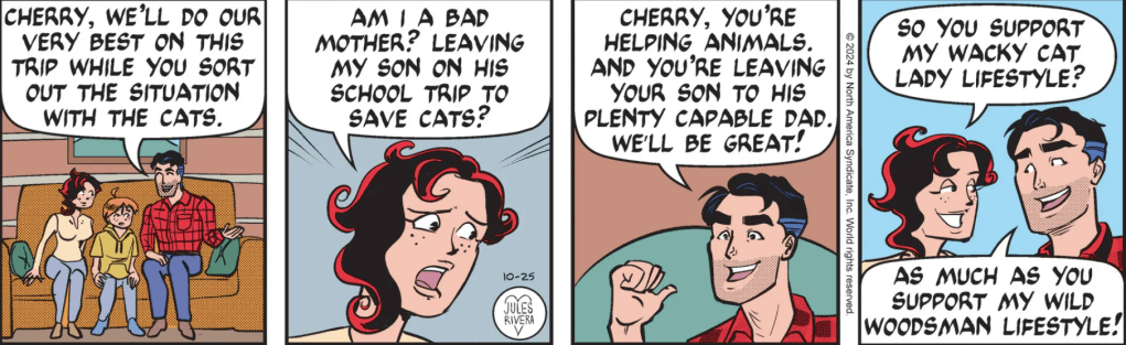Rivera is apparently setting us up for Cherry’s story to resume on Monday. But I have to ask: How complicated is this “box-o’-kittens” situation, anyway? Cherry needs to dedicate another whole week to the kittens!? She already has several people involved, including Violet and Doc Davis. And now, there is Victoria Vex, Violet’s mother and “owner” of the Sunny Soleil Society. Vex gave them 24 hours to get those kittens out of the building. This should be entertaining. Well, there’s hope.