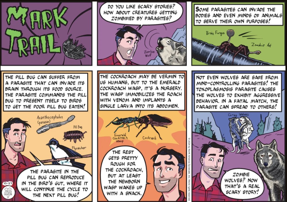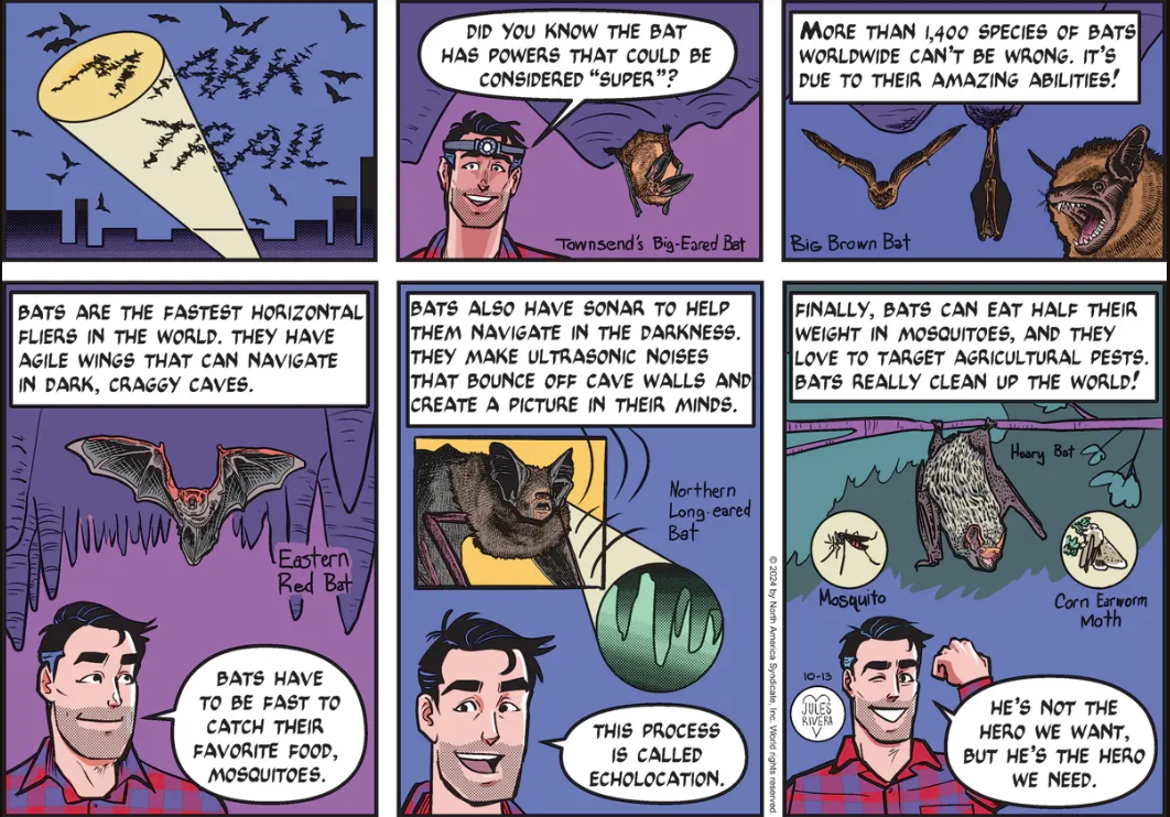 Mark invokes his inner “Batman” in this Rivera Revisit of bats. It seems Jules just can’t get enough of them. Was today’s strip inspired by Mark’s recent Catalina Island foray into a cave, or a homage to his earlier cave adventure under the pen of James Allen? Hard to say, but there’s a whole lot of other animals, plant life, and environmental issues out there to cover. There shouldn’t be any need to recycle Sunday topics at this point, given Rivera’s short turn at bat (did you catch my Rivera-inspired pun?).