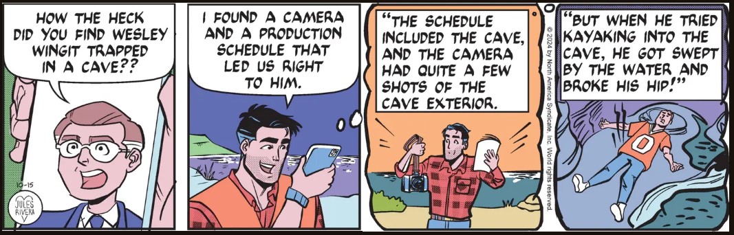 There was no rock “pillow” in the original rescue panels (October 11), as we see today in panel 4. Also, the broken hip wasn’t brought up before, but it explains Wingit’s being carted away by EMTs on a stretcher. I’m really anxious to see Mark explain how they got him out of that cave!