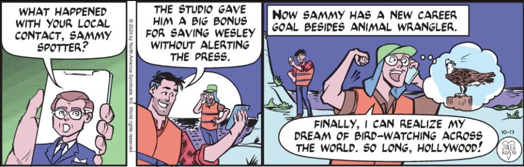 It seems we reached the end of another unfulfilling story. We had a few weeks of strips showing Mark prowling through a mansion filled with indolent, senile lions in search of clues, followed by Mark and Sammy Spotter prowling around a nearby stream to locate a cave where they believed director what’s-his-full-name might be trapped. But first they retrieved Rusty, to give him something to do and brag about back home.