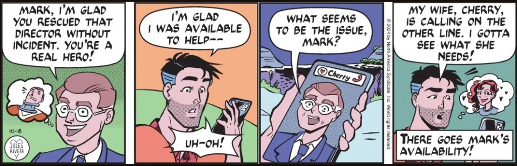 I’m sure glad that Rivera saw fit to put in that helpful circular graphic in panel 1 so we ignorant boobs can understand the technical complexities of putting somebody on hold while switching lines. Yes, I’m taking notes, Jules. On the other hand, there is so much visual clutter in panel 1 that it looks like an attack of the Bubble Monsters. Run, Mark, Run!