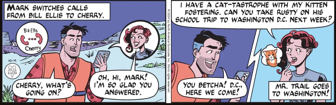 No need to look for drama, suspense, or action today, people. Mark is done with his assignment and Cherry’s only real issue is finding temporary lodging for kittens. No doubt, we’ll have two more days for this apparent pilot for “Leave it to Rusty.”