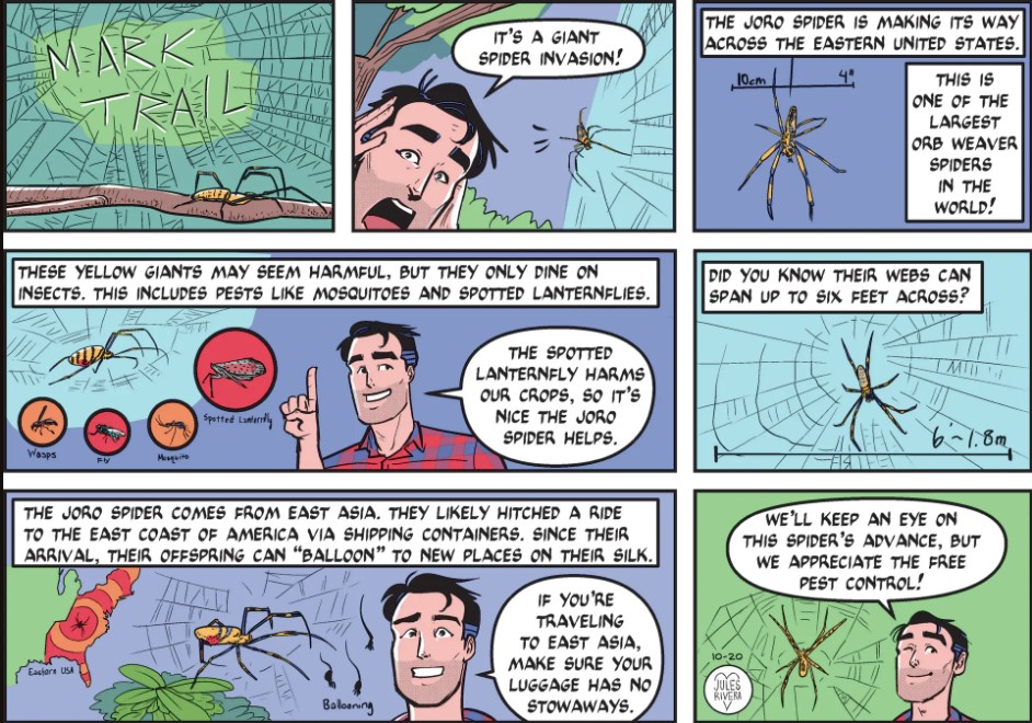 Okay, drawing webs is not one of Rivera’s strengths. She could have easily “woven” the strip’s name in the actual webbing in panel 1, if she had taken the time. I think the Joro-spider looks like a bee with eight legs and no wings. If you are interested, look up the Japanese legend of Jorogumo, the shape-shifting, fire-breathing female spider.