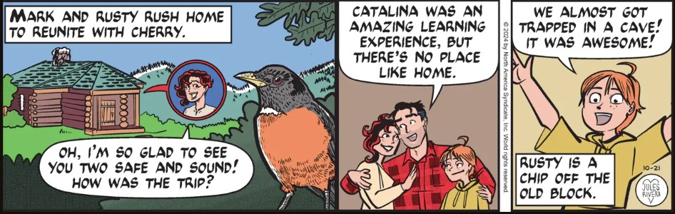 It’s nice to see that Rivera wants to make sure (panel 1) that we know that the person welcoming Mark and Rusty inside that “Lincoln Log” cabin is Cherry, though one could be forgiven for thinking they might have stepped into the wrong cabin, seeing as how it is much smaller and different than other illustrations.
