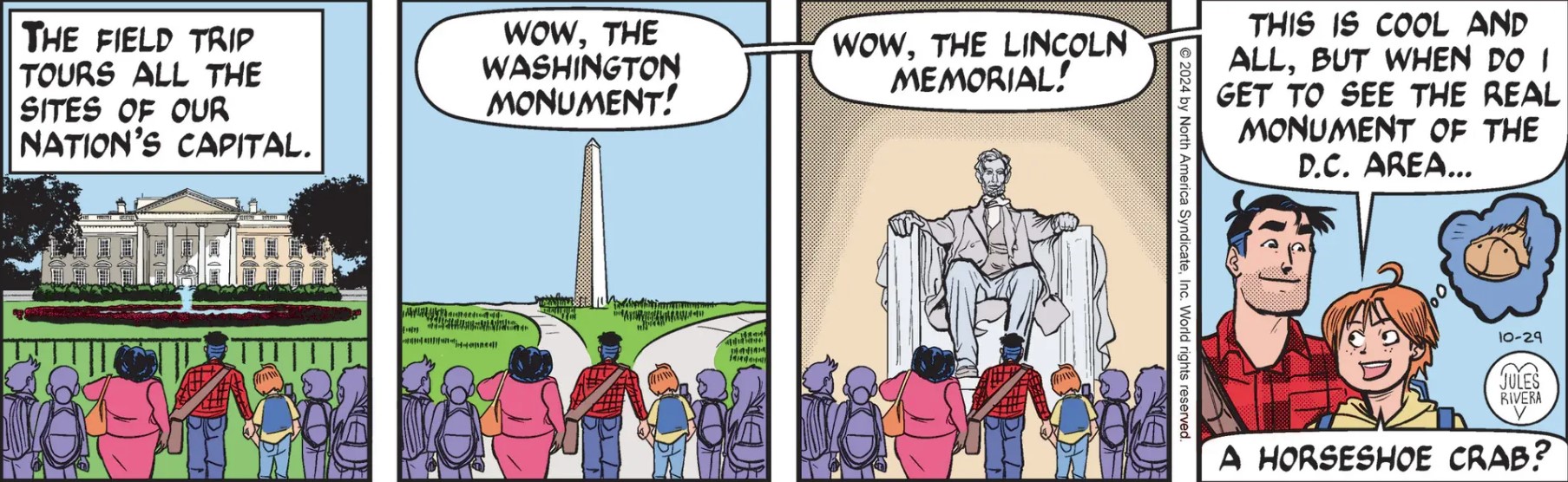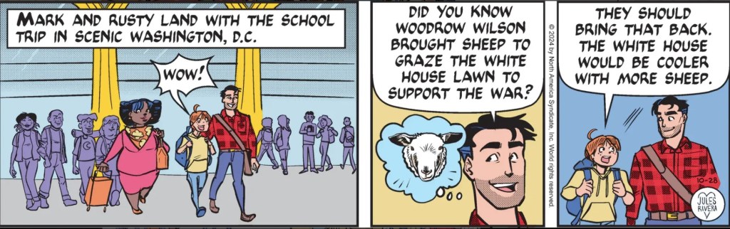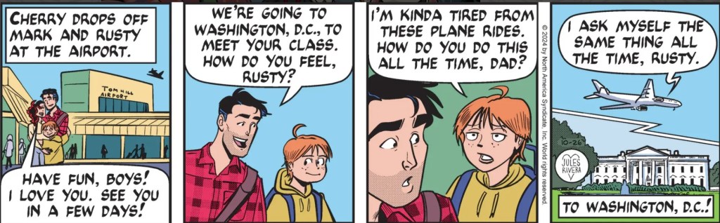 Anyway, it’s a good thing the kids are getting their visit done now, because things are likely to get a bit interesting in our nation’s capital over the next three weeks or so. Say, do you think the woman in panel 1 is a flight attendant, a teacher, a parent-chaperone, or just an innocent bystander about to be caught up in a nexus of impending chaos and absurdity?