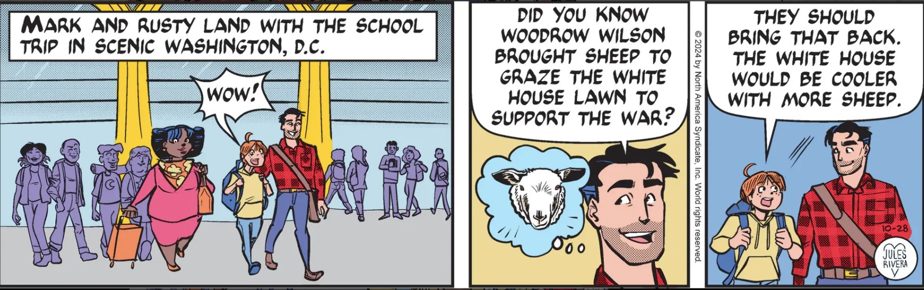 I’m sure glad that Rivera drew that memory balloon of a sheep’s head in panel 2, just in case some readers get the mistaken notion that Mark’s historical note really refers to members of Congress. Otherwise, looks like the students did all fly, after all.