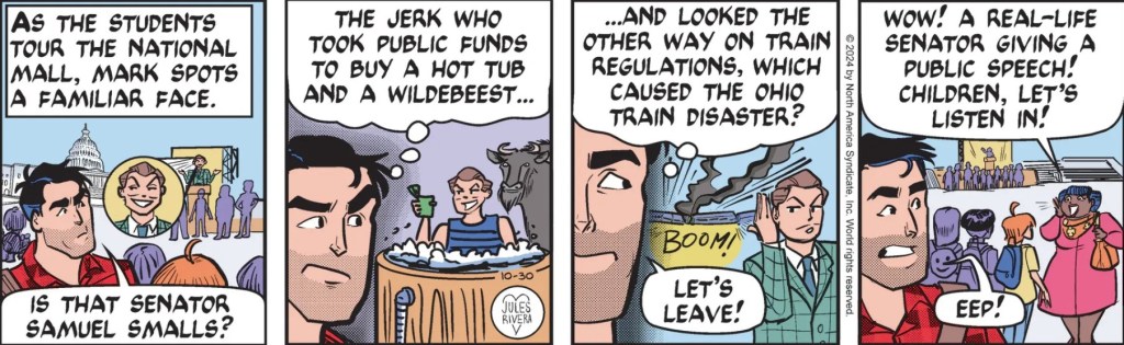 It seems as if Mark just can’t go anywhere without running into one or more of his foes. The story of the Ohio train crash and the senator’s corruption was highlighted in the “Something Fishy” adventure of 2023. At the end of the story, the senator was arrested by local police. In any event, any corruption or bribery charges against the senator were obviously buried, as he is still in office a year later.