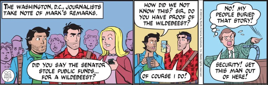 As I live and breathe, this time some journalists do, in fact, get involved in Mark’s confrontation. And once again, Senator Smalls calls on Security to solve his problem. Interestingly, Mark has yet to reveal his Secret Identity as a Wildlife and Environmental Journalist. At least, I think that is what he is.