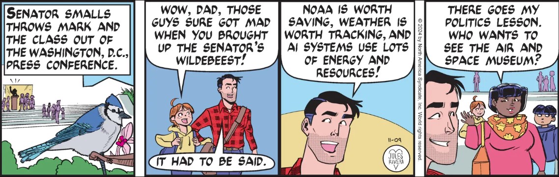 Art Dept. There is something odd about the art today. Mark’s facial expressions don’t line up with how we normally see Rivera portraying him. And as for panel 1, that is my biggest shock. There are several noteworthy features: 1) the bushes exactly frame the lower half of the blue jay, rather than flow naturally behind the bird. 2) The extreme flatness of the scene is jarring. The “white” polygonal shape suggests architecture, but also doesn’t. It’s just a flat, irregular white shape. The steps and backdrop seem to float over it, as if it is somebody’s partial recollection of an event. The upper profile of the white shape mirrors the flow of the bushes. That continuity, in itself, is good classic technique.