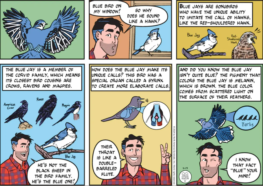 As usual, Rivera provides an interestingly customized title panel. Today’s info may or may not be new to you, but credit Rivera for focusing on just one feature; or maybe two. I did some more reading: The “blueness” comes from scattered light due to the internal structure of the feathers. This feature was first analyzed by Robert Hooke in 1665 and later explained by Isaac Newton. Crushing a feather destroys that structure and the blue disappears, leaving behind the natural pigment. That will be a fun experiment to try (with the feather off of the bird, of course). But I do wish Rivera would reduce Mark’s appearances to just the first and last panels. Then there would be more room for the subject matter.