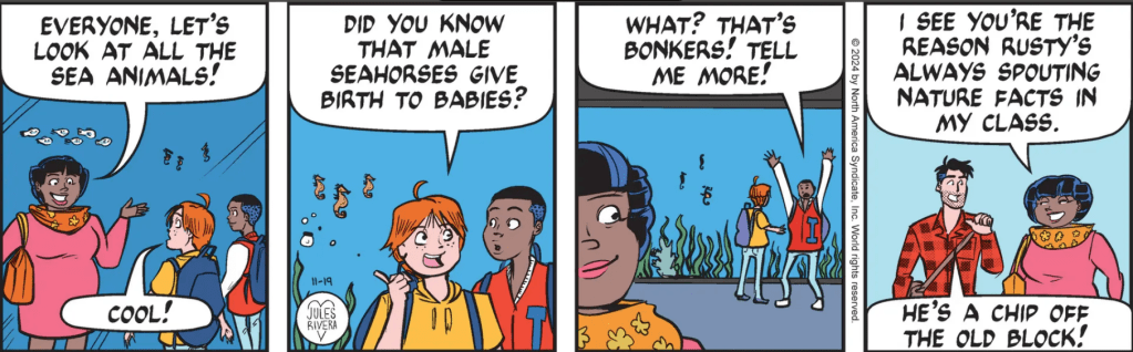 Hoo-boy. ”Let’s look at all the sea animals!” Really!? I thought this was Middle School, not First Grade. And what reason does teacher Mavis see that leads her to believe Mark is the reason for Rusty’s extemporaneous facts-spouting? It’s bonkers.