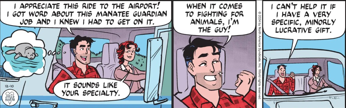 To get this out of the way, today is just rubbish in terms of story development. Mark inexplicably thanks Cherry again for the ride then immediately jumps into how wonderful a guy he is. A “guardian” he calls himself? What qualifies him as a guardian of a manatee when there are scores of professional marine biologists at hand? Maybe he means “bodyguard.”