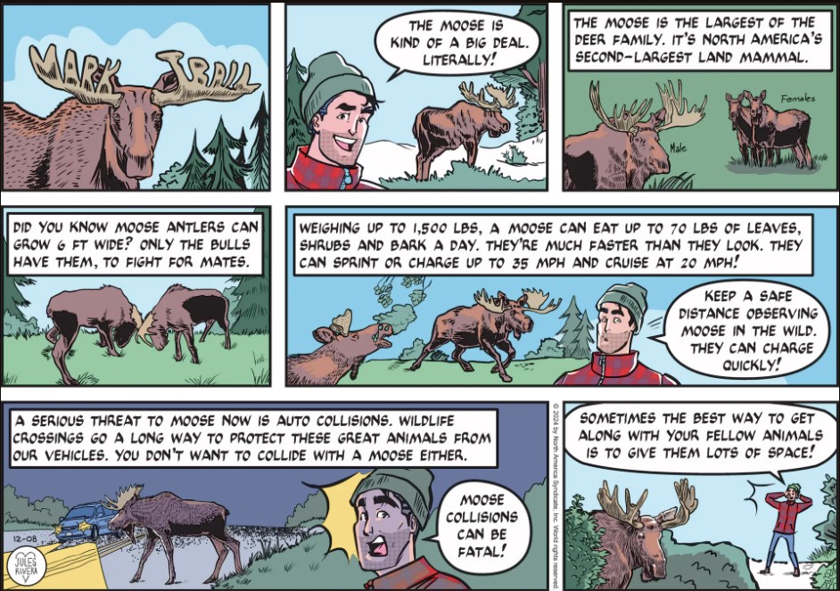 A nicely-composed title panel leads us into this brief presentation, including some sound advice for presumptuous tourists and distracted drivers. You likely won’t run into a moose unless you live in or visit the upper United States, Canada, or northern Europe. As bad as it is to collide with a moose on the road, colliding with something as small as a deer on the road can also be dangerous to drivers and bikers. I always get a bit nervous and cautious driving through forested areas, especially in the Fall during mating season. When driving in northern Minnesota, the only way I want to see a moose on the road is in my rearview mirror!