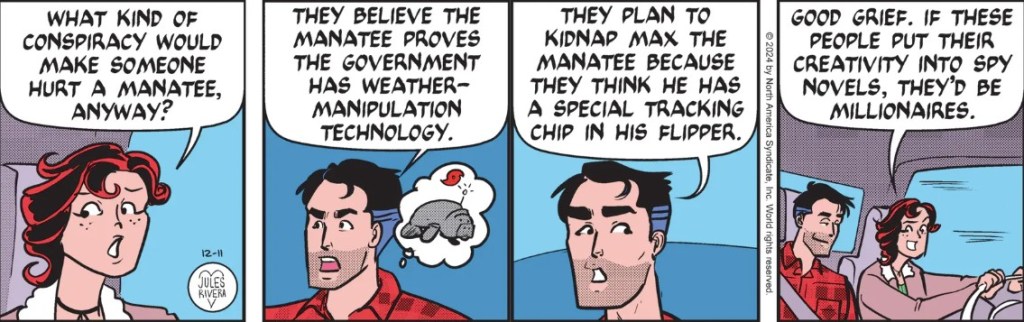 Another twist in the story: A conspiracy theory that meteorology is evil. Sure, why not? There are plenty of real world, goofy—that is to say, paranoid and stupid—claims about government controlling the weather. Real meteorologists get harassed and receive death threats. And what does a business that moves manatees have to do with meteorology, anyway? Sometimes I wonder if the Middle Ages really ever ended.