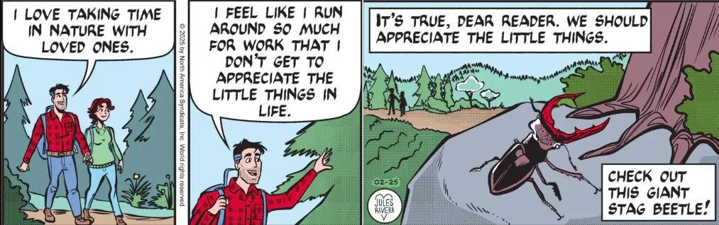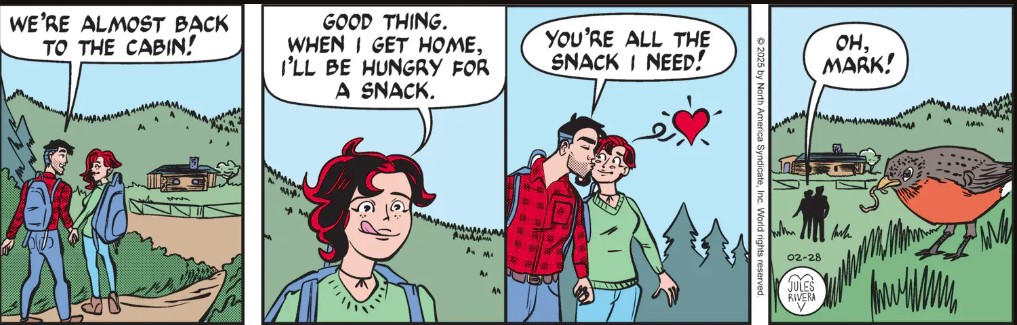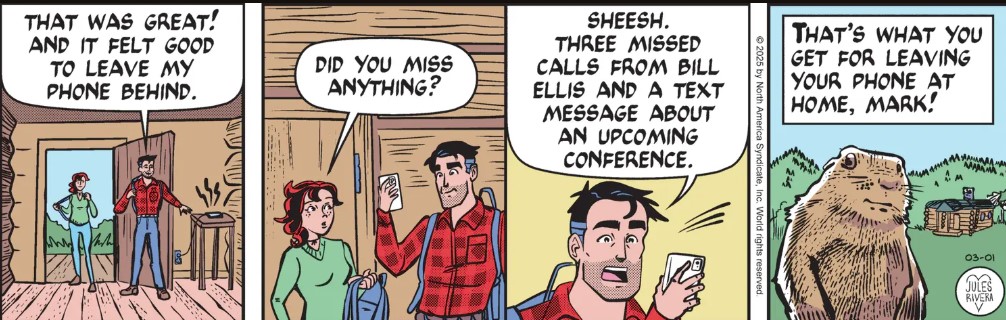 The non-tech nature walk is finally over. But it’s disingenuous for Mark to suddenly get apoplectic over his missed technology, don’t you think? Rivera might be saying something along the same line in panel 4, but she gets no laugh from me, since she’s the one that made it all happen.
