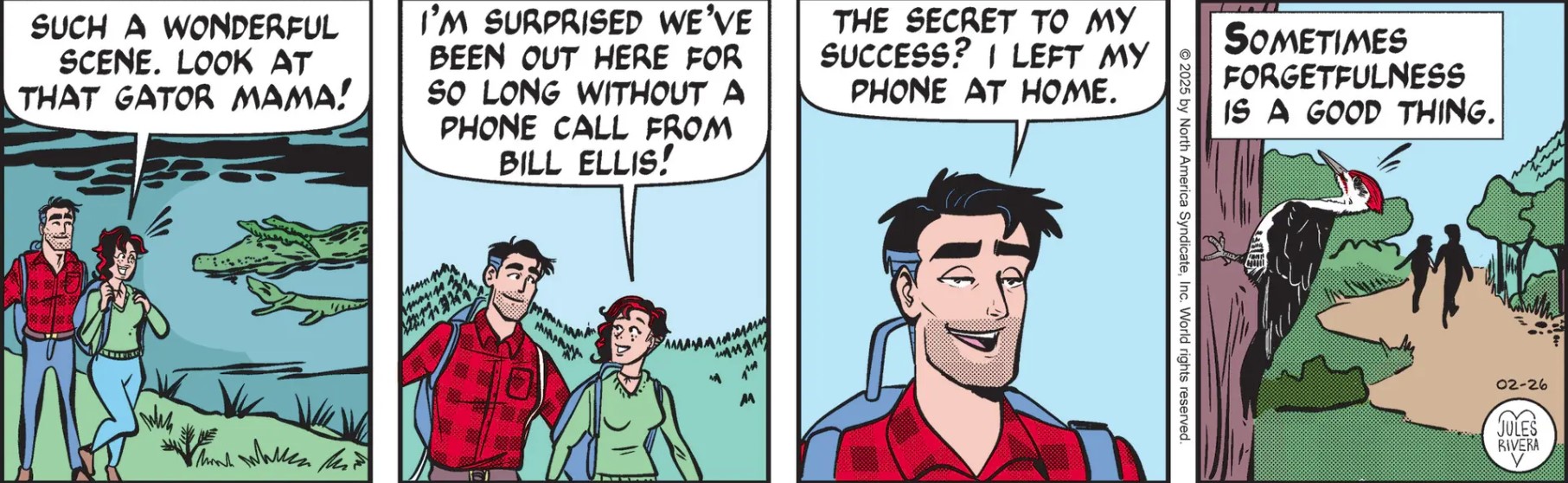 The non-tech nature walk is finally over. But it’s disingenuous for Mark to suddenly get apoplectic over his missed technology, don’t you think? Rivera might be saying something along the same line in panel 4, but she gets no laugh from me, since she’s the one that made it all happen.