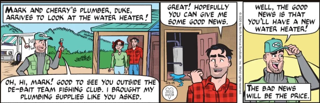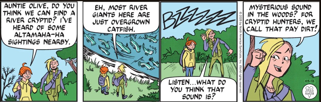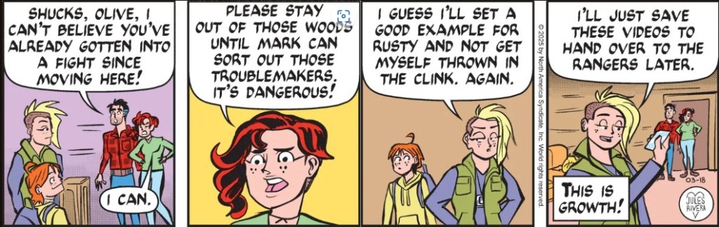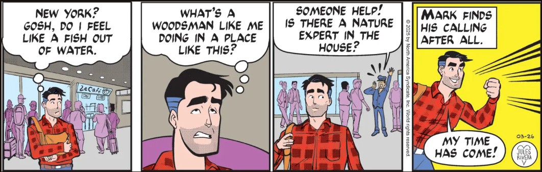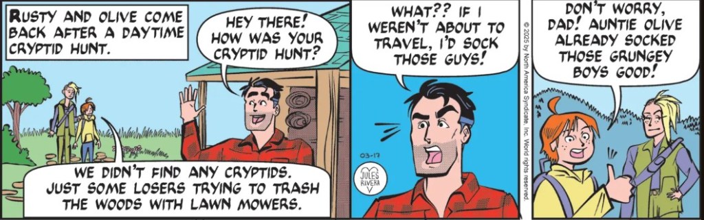 Sounds incredible? Ludicrous? Far-fetched? Well, let’s remember that Jules Rivera’s Mark Trail strip is more absurdist comedy than drama; more Crocodile Dundee than Steve Irwin: Crocodile Hunter.