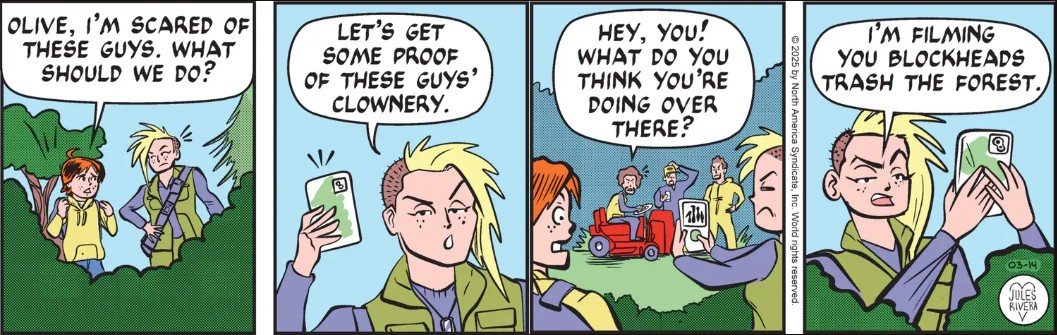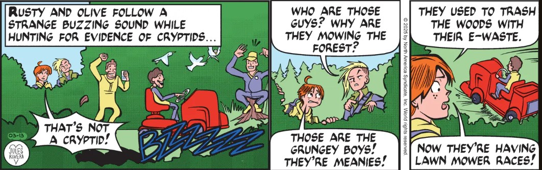 But to play Devil’s Advocate, are the Grungy Boys actually breaking any laws? Are they illegally destroying natural habitat? Or are they just horsing around on a riding lawnmower, like kids on ATVs? They don’t appear to be littering, in spite of Olive’s assertions in panel 4 of Friday’s strip.