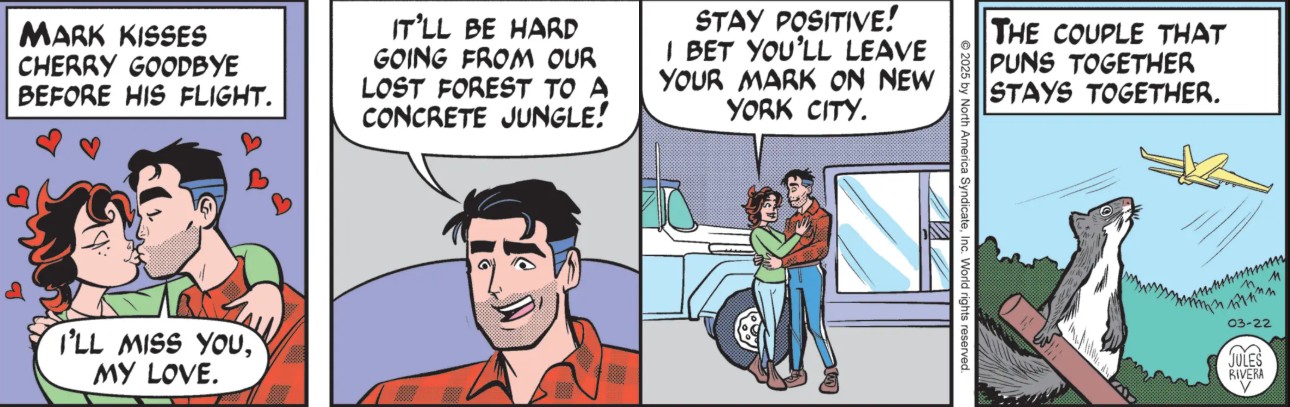 It took eight panels for Mark and Cherry to get their Goodbyes done so he could fly out. Regular reader Daniel Pellissier noticed a squirrel in the last panel, apparently holding a stick or club. Daniel’s comment was that the squirrel would use it on Mark and Cherry if they didn’t finally break it up so the story could take off, so to speak. That’s how I took his comment, anyway. And that was the week.