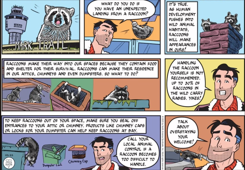 The last panel is, alas, another attempt at humor, wasting a panel for what could have been additional helpful information. Besides, it’s a non-sequitur. Any visit by a raccoon is unwelcome, regardless of the length of stay.