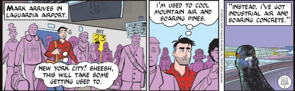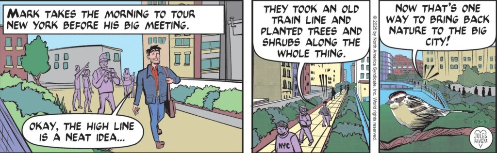 So, Mark discovered The High Line elevated walkway in West Manhattan. Good for him! We can see in panel 2 and panel 3 that Mark must be very impressed by the walkway, given those elaborate triple emenata lines extending above his head. I wonder how he’ll react if he goes far enough north and discovers Central Park?