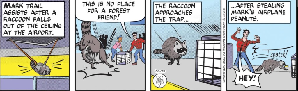 As Mark approached, the raccoon fell to the floor and started running towards the cage. Along the way, the raccoon jumped up and snatched some airline peanuts that Mark apparently was holding. Then he ran into the cage. Mark was no actual help, but he also spent no time finding out what actually was going on. He just walked on! Seems odd behavior to me. Regular reader, Mark “the Contrarian Commenter”, testified that “…it appears the past 3 days the dialog and artwork is more legible,” and thought maybe a ghost artist was filling in for Rivera. That’s quite a positive comment from Mark! So, what do you think? There is certainly a brighter tone and mood, perhaps contrasting with Mark’s earlier dark mood and the darker hues seen in the first several strips this past week.