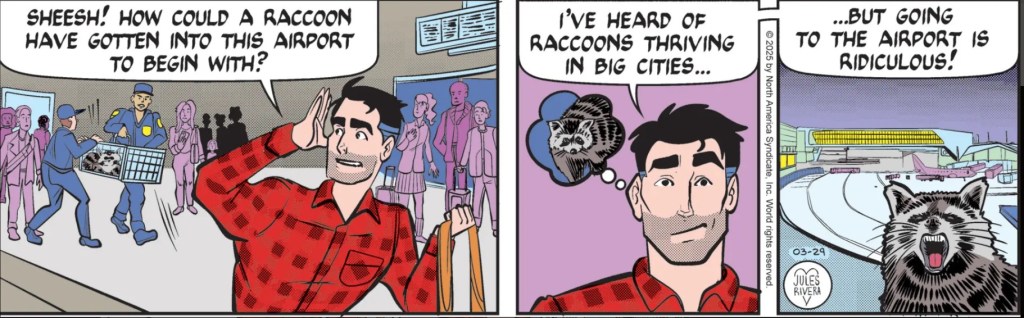 Yet,I am confused: Just which direction is the raccoon? Is he to the left of Mark (panel 1), the right (panel 2), or across the terminal (panel 3)? Could just be me, as I’m still gobsmacked by Mark’s curious use of antique phrases.