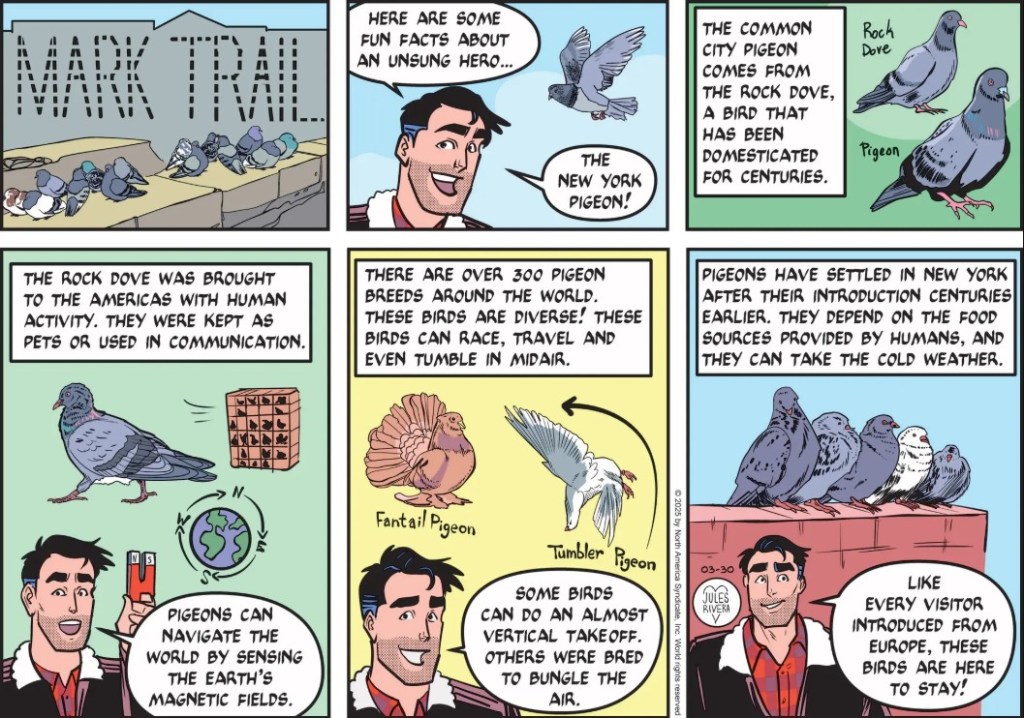 Rivera sneaks in a subtle comment on immigration into today’s nature strip dealing with pigeons. I’m afraid I’m too dense to figure out the point or significance of the special typography of the title in panel 1. Any ideas? But as she often does, Rivera links the nature subject to the locality of Mark’s current story. From what I’ve read, pigeons use a variety of navigation techniques, in addition to sensing magnetic fields. But I have no idea what “Bungle the air” means (panel 5). Do you?