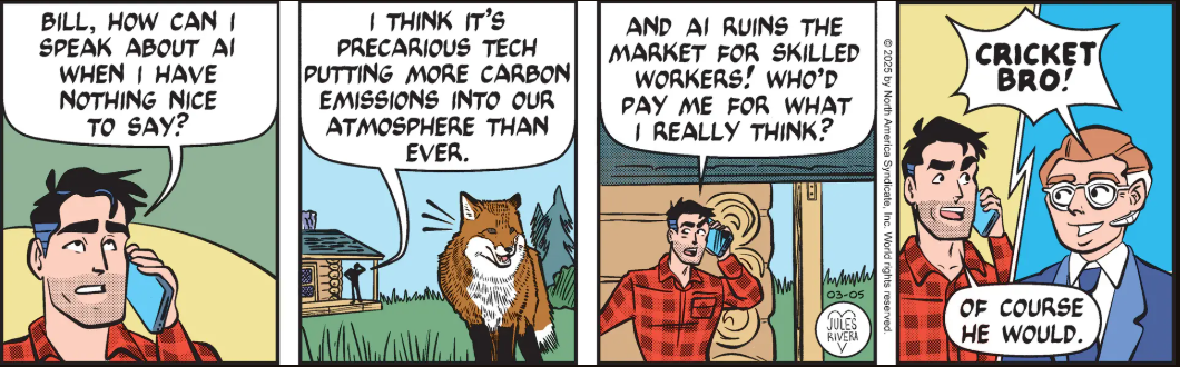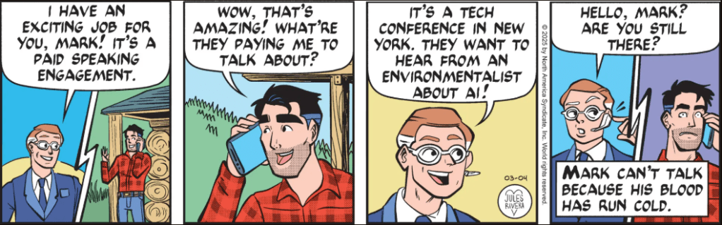 Clearly, Mark has a limited view on AI and has not investigated areas that might hold positive benefits, the energy-hogging data centers notwithstanding. There’s no end of people pooh-poohing and raising flags about AI’s problems. For once, Mark is right (panel 1). So there must be something else, right?