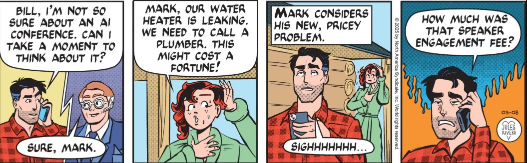 Oh, poor Mark. Thrown into the fires of fate by reality, or at least by a diabolus ex machina (by the way, I like that fiery symbolism in panel 4. Good imagery!). We know that sometimes reality bites. And it sure looked like Mark was about ready to turn down Bill’s proposal, too. So sorry, Mark!