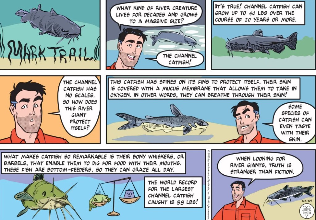 Was anybody looking for river giants, as Mark concludes? I wasn’t and I don’t recall Mark being curious any time recently. Until now, of course. Anyway, we get a topic that is unrelated to the current or most recent adventures. Unrelated nature topics were common in pre-Rivera times, whereas Rivera often focuses on creatures and environs related to Mark’s or Cherry’s current adventure and location.