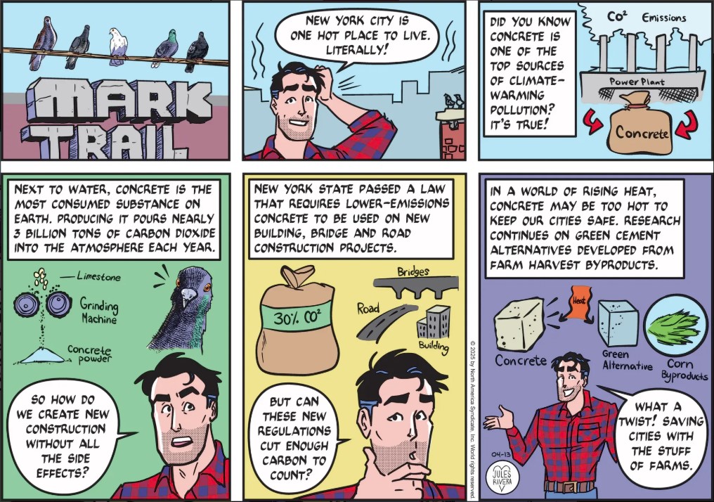 A concrete-molded title panel graces this weighty discussion. Okay, enough with the puns. The topic has serious points to make. As panel 2 suggests, concrete explains a lot of why urban centers are almost always hot spots. While cities demand that science develops less harmful concrete, they could look more closely at the Romans. The ancient Romans developed a recipe for their building material that is often more durable, self-healing, and less harmful to the environment (not something they would have been aware of or cared much about).