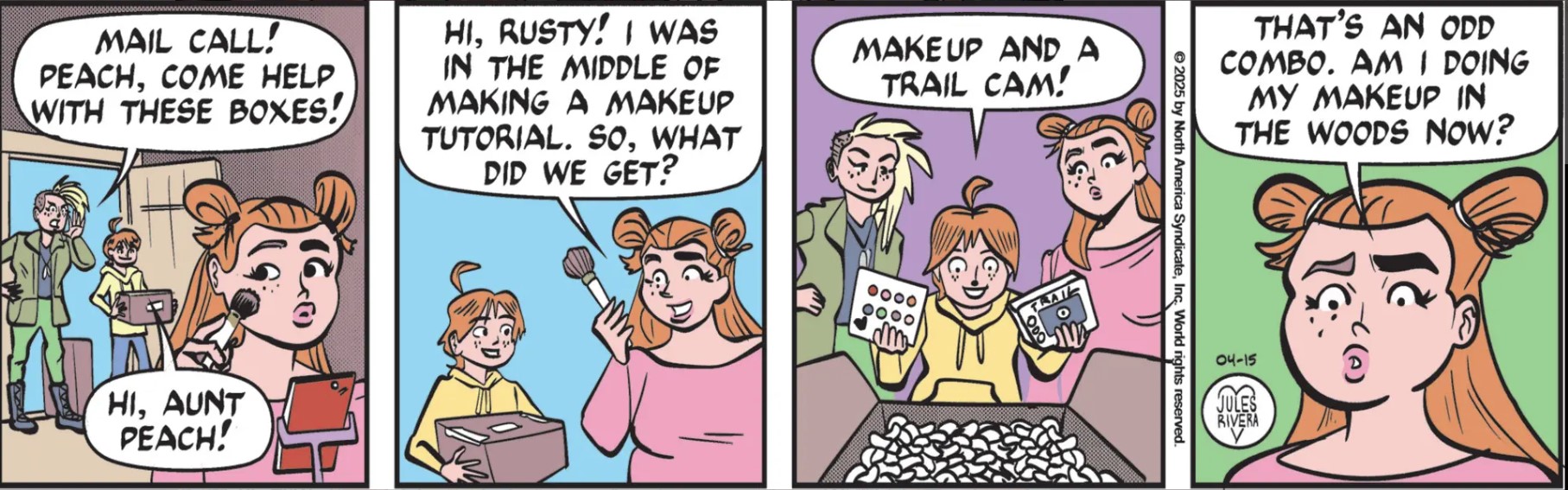 Art Dept. I know that Rivera has commented before about going old school and using non-digital drawing tools (i.e. pen and ink). That kind of looks like what we see in panels 2 and 3, unless somebody else drew them. The style resembles a slightly more finished version of her storyboarding technique, though I hesitate to show them here without permission. Just look her up on BlueSky where she posts. As pen drawing goes, more practice should help. As I’ve mentioned more than once previously, that her Mark Trail style appears to be an outgrowth of her storyboarding approach.