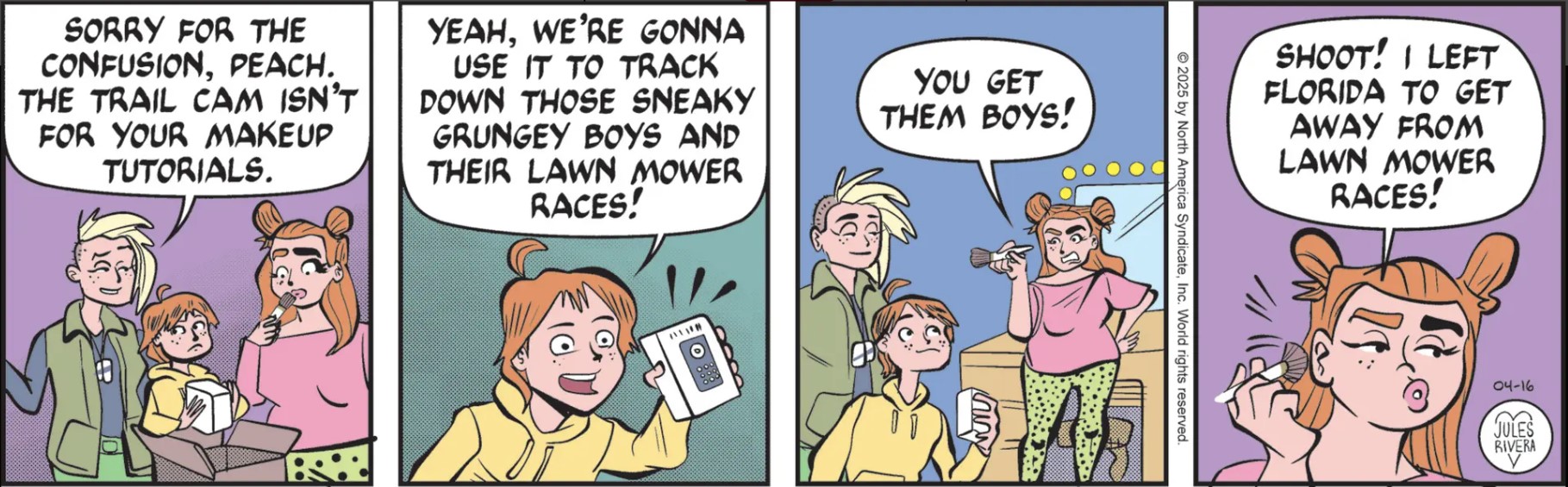 So far, we don’t really have anykind of story going on. Sure, there was the incident with the Grungy Boys and the riding lawnmower in the woods several weeks ago, but nothing has come of that so far. Instead, we see the kind of desultory activity and dialog that can be found in Mary Worth, Judge Parker, Sally Forth, or even Hi and Lois. So why do we need any more of that!? This is supposed to be a nature-based adventure strip, right? This doesn’t even look like Rivera’s normal version of Mark Trail. Maybe Rivera could look at spinning these sisters out into their own strip where she can indulge these whimsies in greater detail and length.