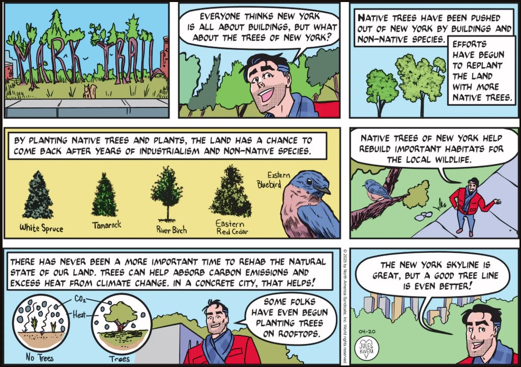 Custom title panels are a hallmark of Rivera’s Sunday Mark Trail strips. The conception of today’s title is very good, though the execution is a bit slack. Anyway, it’s nice to see that Rivera can draw or copy realistic trees when called upon (panel 4). Would be nice if she could draw them in the regular panels, too.