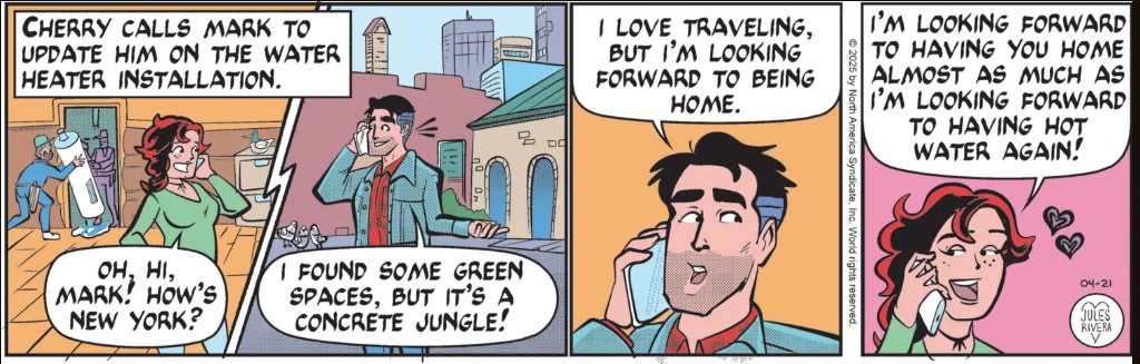 One of the things I had early on complimented Rivera for is expanding the home life of Mark and Cherry, giving us more than just pancake dinners, front porch discussions, and tearful goodbyes. However, it can swing too far the other way, as exhibited here. And this is not a singular occurrence. But I don’t think breaking a storyline to indulge in insignificant small talk is a good idea. Coming back to Mark’s adventure after a week with Olive and Rusty, we should expect to see something going on with Mark and the AI Conference. Tempo! Tempo! Tempo!