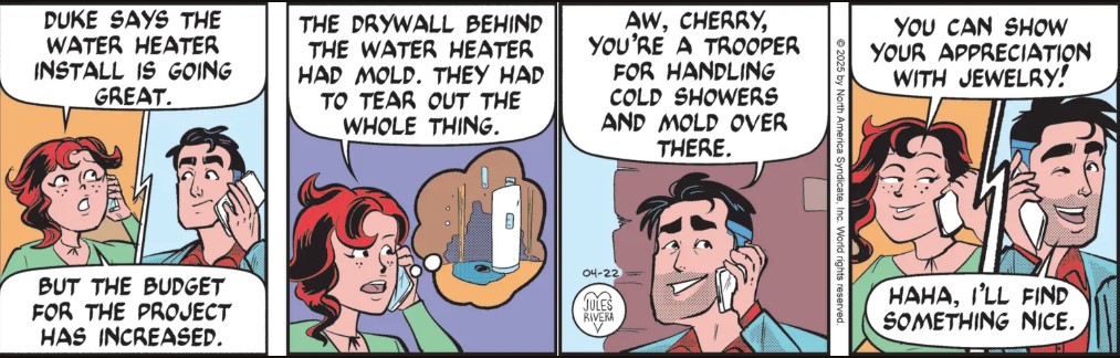 Cherry: “Mark, Duke found mold on the wall behind the water heater. Good thing you took that paying assignment!” Mark: “Rats! Maybe I can weasel some more money out of that weasel, Cricket Bro. How much more for the repairs?” Cherry: “Don’t worry, I got it covered, Mark. Oh, I picked up some gold jewelry in town today.” Mark: “WHAT!? I took this job because I thought we were short on cash, Cherry! And since when did you start wearing jewelry? It’s not like the wildlife care. How much did it all cost?!” Cherry: “Don’t worry, Sweetie. But Duke likes bling, and you always say it’s important to keep your contractor happy.” Mark: “Oh, yeah? Well, I’m taking the first flight home. Then it’s Bam! Zoom! To the Moon!” Cherry: “Uh, well … I’ll have my brother, Dirk, and his hogs, pick you up at the airport.”