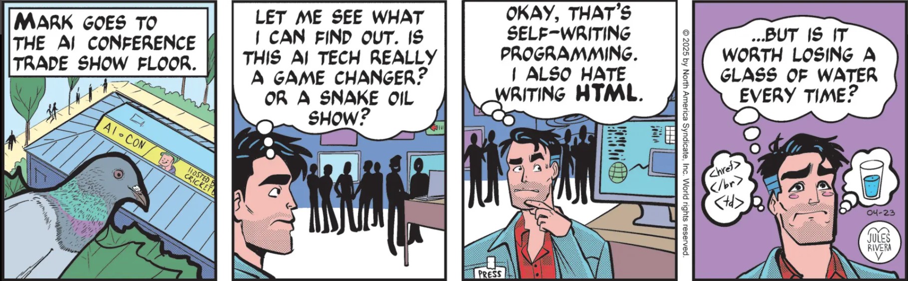 So now Sid wants to dump some AI technology. Big deal! That’s hardly the doomsday scenario that Rivera sarcastically suggests in panel 4. But exactly what is Sid’s sale going to change, as Rivera implies? Perhaps Mark’s opinion of A.I.? He already knows Sid Stump is a con man. So will Mark assume that along with Cricket Bro, this conference is just a scam, a front for some nefarious plot to make the cost of E-bikes ever more expensive? Guess we might find out in due time.
