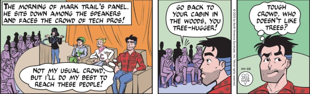 Weighty issues for this strip, given that most of the stories Mark handles are wrapped in layers of parody, absurdity, and cheap puns. The point here is that whenever something serious comes up, instead of exploring it in a serious manner, Jules Rivera shifts the focus and heads back into comic land. And so it is that Mark eventually spied one of his former nemeses, Sid Stump, on the phone trying very hard to dump some AI technology as quickly as possible. Perhaps it was seeing Stump, but Mark’s position on AI returned to his negative position very fast. He seemed to conclude that AI developers were in it only for the money, not for any long-term benefit to humanity. Will Rivera take the story back to crazy land? Let’s see how things continue this coming week as the conference begins and Mark presents his own take on AI. But first …