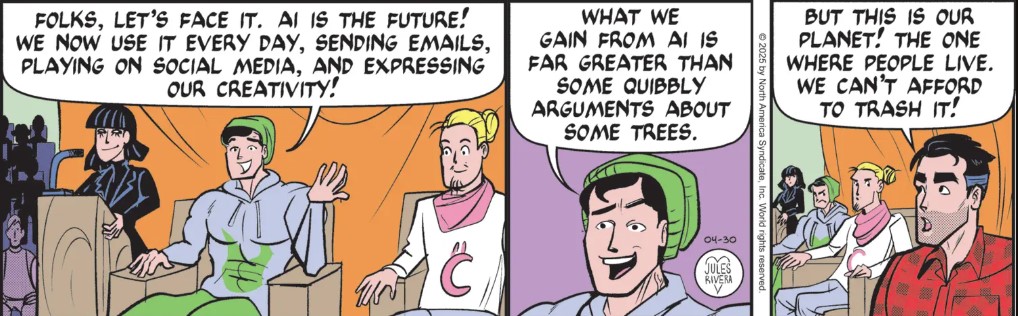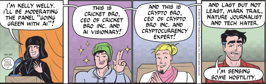 Hmm, I thought the topic is “Going Green with AI”, but Cricket Bro seems to be arguing against that. Cricket Bro’s opening remark in panel 1 lays the foundation for his thesis in panel 2. Seems like a strawman argument to me, as it does to Mark. But, it’s early, so let’s see how the panel discussion develops. At least Mark is stepping in to counter Cricket Bro’s distortion, even if his statement is self-evidently obvious (“This is our planet…the one where people live.”). I don’t know why Mark didn’t dress up in a smart sports jacket, tie, and slacks in order to throw off Cricket Bro and the audience. Instead, his clothes have a big target on him that says “I live in the woods.”