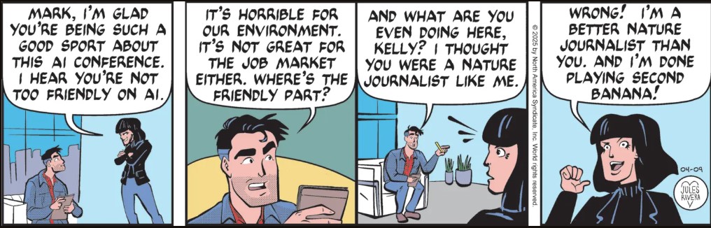 Who knows!? Maybe Kelly is a better nature journalist, which is why Mark gets the weird and silly assignments. Of course, this sets up a real conundrum for Rivera. Can Kelly Welly be as good—or better—than Mark, in his own comic strip? Or is Bill Ellis a secretive, conniving SOB for sending both Mark and Kelly on the same assignment to see who submits the better story?
