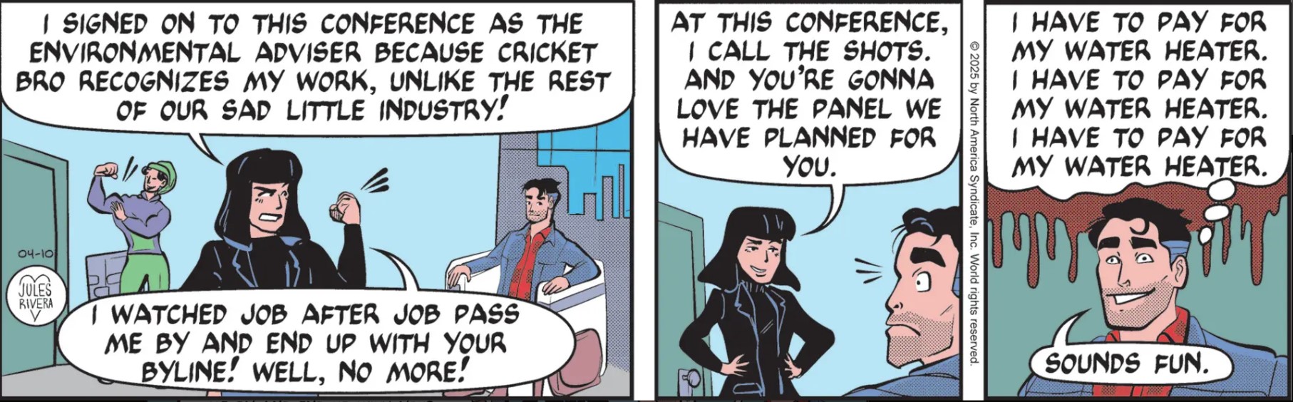 Kelly Welly has moved on from a mere journalist rival to nemesis status. I’m confused, though. Is nature journalism the ‘sad little industry’ Kelly references in panel 1 or the ‘environmental’ industry?