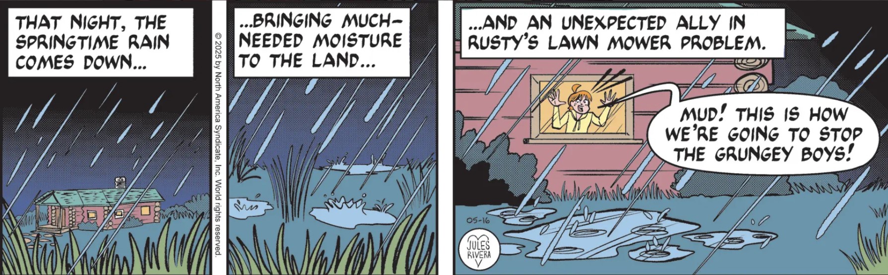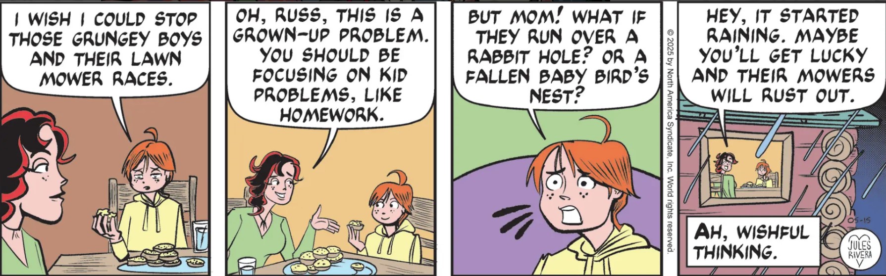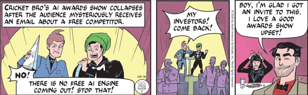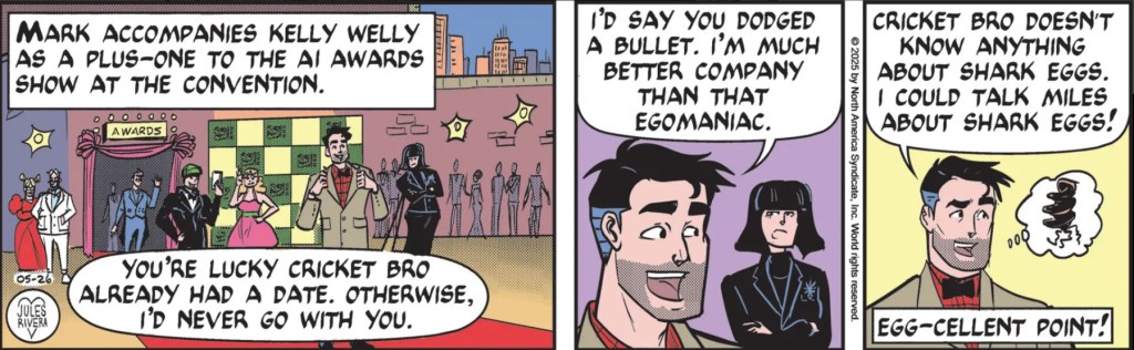 Following long-standing tradition, we get to enjoy the site of Kelly Welly (panel 4) pulling her hair out in frustration at the realization that she once again backed the wrong horse. Jules Rivera actually did quite a good job drawing her! And we can enjoy seeing the schemes of Cricket Bro and Sid Stump come crashing down around their feet.