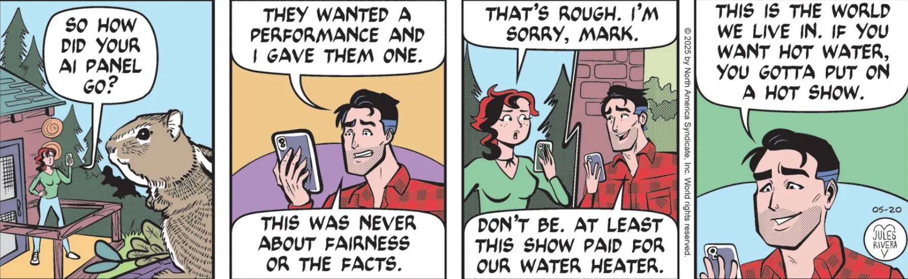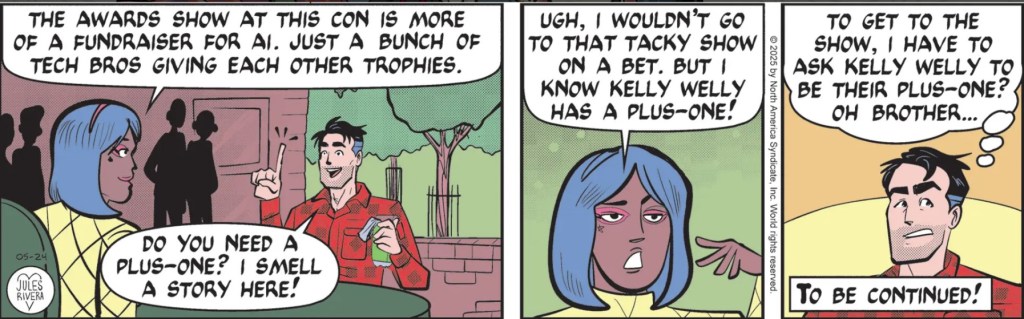 Rivera has resorted to one of her trademark story-ending memes, having Mark break the fourth wall to offer us readers a TV sitcom style retort. I think Rivera oversold the scene by putting Mark in the foreground. A funnier version would have been to show Mark still sitting at the table behind him and turning to talk to us, as Kelly simultaneously goes crazy. It would be like how Mel Brooks created an in-context fourth wall ending for Blazing Saddles, when Sheriff Bart and the Waco Kid got on their horses and rode out of town, dismounted, then got into a waiting limo to drive off into the sunset. Great scene and great movie!