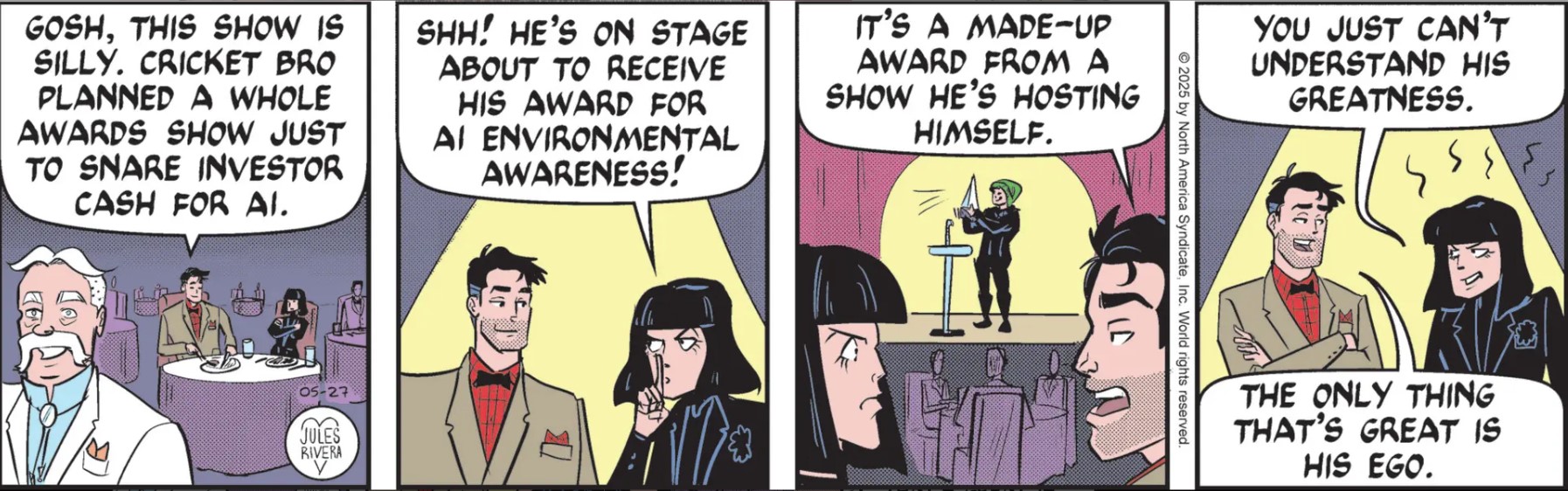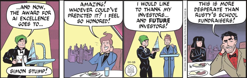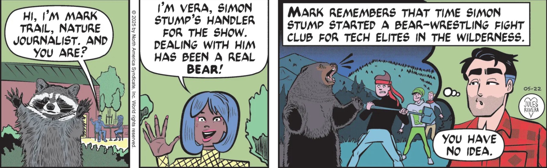 Well, for those who came in late, this entire story is one of Rivera’s favorite tropes to satirize: The foibles, corruption, and jerks in the high tech industry. Investigating tech industry fraud or corruption (especially where it might have an impact on the environment), has been one of Mark’s most common plot devices since Rivera took over.