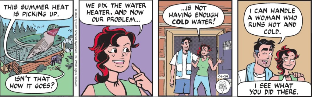 There goes Rivera once again, wringing out yet another sappy 3-panel gag strip, featuring the “mom packs for a six week vacation” trope. Real comedy gold. If the hokey poses of Mark and Rusty in panel 2 aren’t contrived enough, in panel 3 Rivera has them standing in the doorway, looking gobsmacked (“Uh-oh, there goes Mom again!”). Yet more sitcom tropes worthy of Nickelodeon. But this just does not fit Cherry’s personality. I’m wondering if Rivera is making these choices on her own or if she’s getting advised from people at King Features on ways to make a strip about nature and the environment appear cute and appeal to more readers (maybe like the kind of people who enjoy Hi and Lois and Garfield).