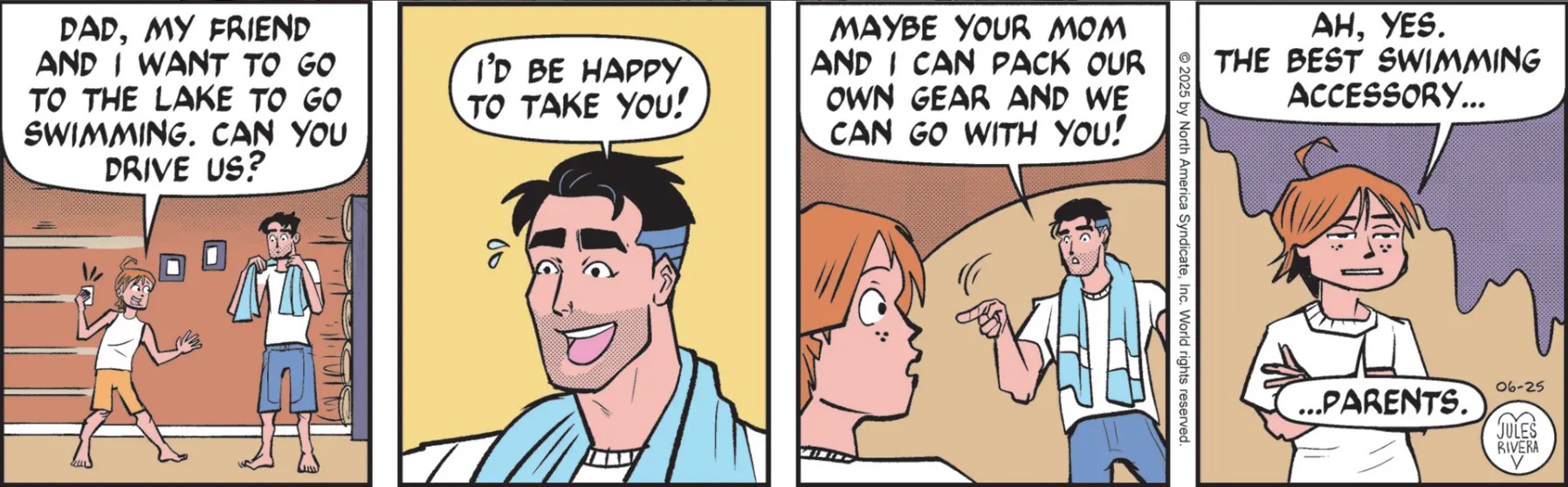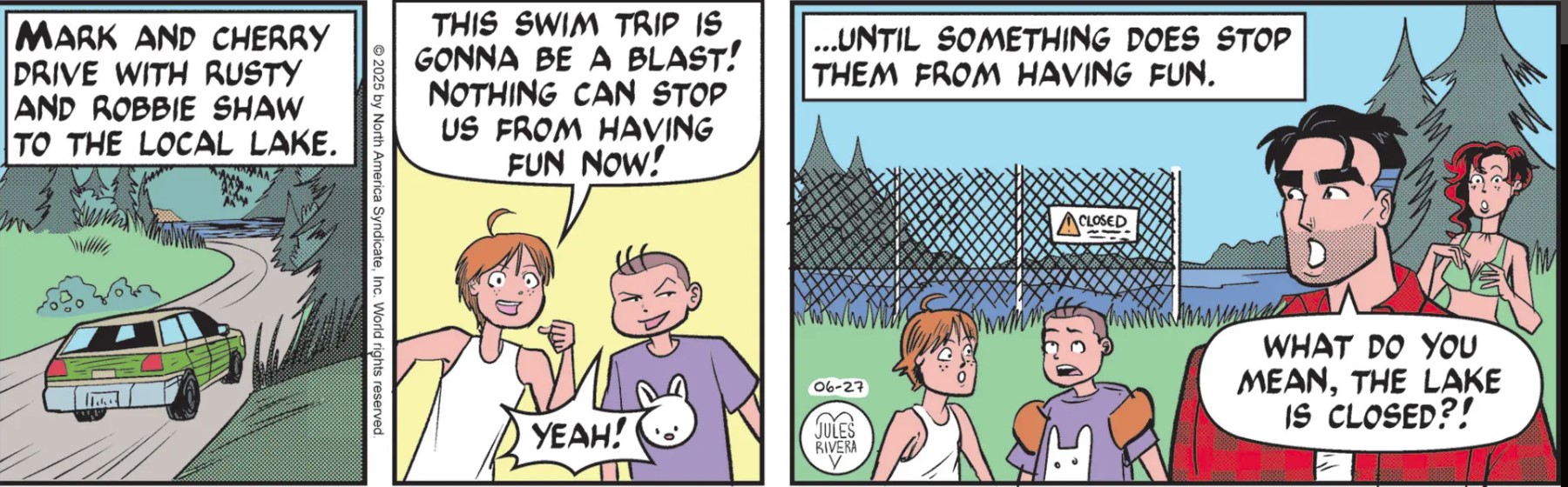 Art Dept. In Panel 3 Jules Rivera employed her usual elliptical “panel arc” I mentioned the other day. It fulfills its role of highlighting the person talking. But in panel 4, Rivera cleverly reconfigured the arc by transforming it into what looks like a wall of oozing paint, dripping diagonally down. This “melting arc” still highlights Rusty, but also reflects his sinking feelings about going swimming his friend and his parents.