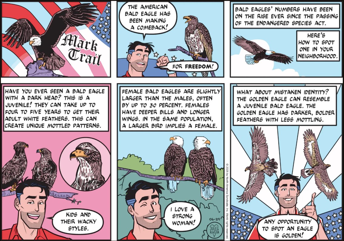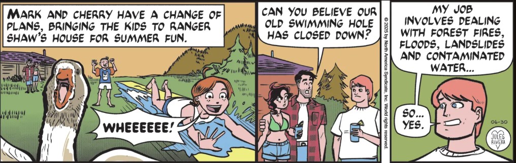For today, Jules Rivera gives us a wildlife present for Father’s Day. Even more than usual, Mark needs to impart his own snarky comments, distracting as they are. Personally, I’d prefer he spent more time with his family instead of mugging in almost every panel. In fact, it would be just fine to limit Mark’s personal appearances to one panel at the start and one at the end.