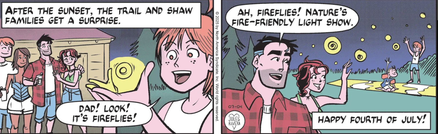 Aside from the fact that lightning bugs (fireflies) don’t look anything like floating donuts or snail shells, Rivera has decided to actually acknowledge the holiday today, and that’s about all that can be said. Except that the Fourth of July is not necessarily a Day of Independence celebrated by all, especially those whose ancestors in America who were not independent or made “free” on that July 4th day in 1776, and for many decades after.